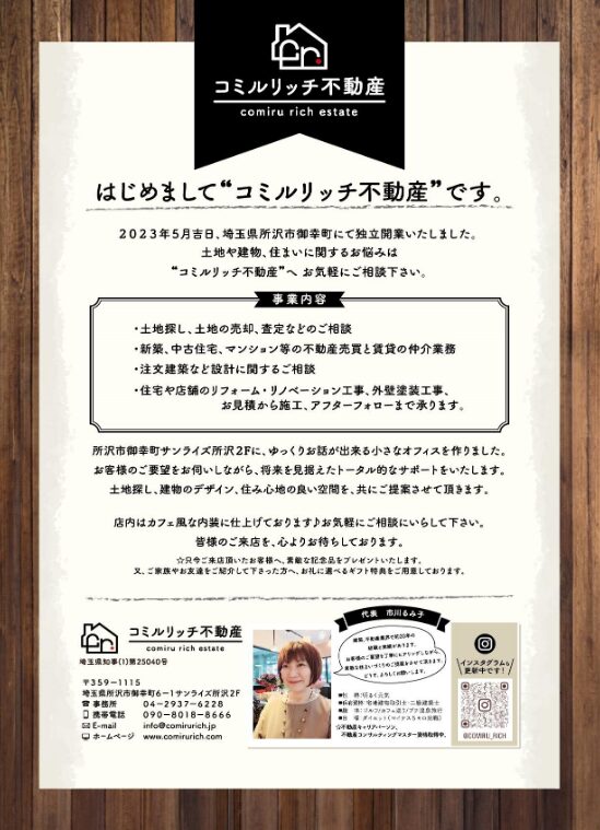 ■埼玉・東京で土地探し、戸建・マンションの購入・新築分譲住宅・中古戸建のご紹介等々、不動産仲介業務をはじめ土地や建物、住まいにに関するご相談、又中古戸建やマンションリフォームやリノベーション工事、賃貸お部屋探し・店舗テナント探しでお悩みの方は”コミルリッチ不動産”へ。